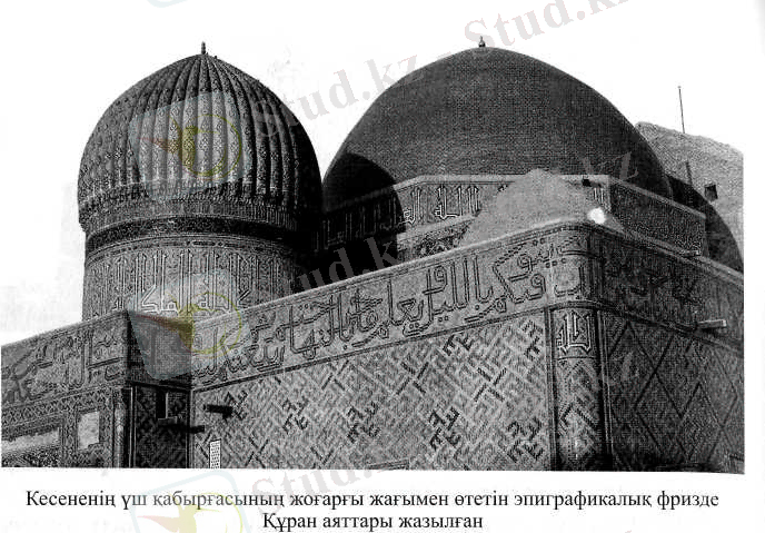 Кесененің үш қабырғасының жоғарғы жағымен өтетін эпиграфикалық фризде Құран аяттары жазылған. Фриз екі майолика жиектасымен шектелген. Фриздің биіктігі жиектассыз -2, 37 м, ал онымен бірге - 2, 62 м. Кесененің екі солтүстік бұрыштары тіректерге тіреліп, іргенің панелі мен эпиграфикалық фриздің арасында орналасқан. Солтүстік портал қабырғаларының көркемдігі көрген жанды таңғалдырады. Бұл портал ең сәнді, әсем бөлімі болып табылады. Осы түстан қабірхана күмбезі анық көрінеді. Қабірхана күмбезі бұрыш-бұрыштағы төрт бөлікке биік мойындықпен көтерілген. Сыртқы күмбезі қатпарлы, бұл қатпарларда өсімдік өрнегі бар, пальмитталар мен медальондар түзетін әйнекеймен қапталған. Ірге бөлігі қашалған тас алты Қырлы, көк түсті тақталармен әшекейленген.
