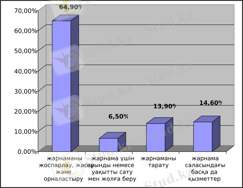 Екінші суретте көрсетілгендей, жарнаманы жоспарлау, жасау және орналастыру пайдалы, жалпы пайда көлемінің 64, 9%, яғни 14, 8 млрд. теңге осының үлесіне тиеді, ал жарнама үшін орынды немесе уақытты сату мен жалға берудің пайдалығы аз, бұның үлесіне тек 6, 5%, яғни 1, 4 млн. теңге тиеді.