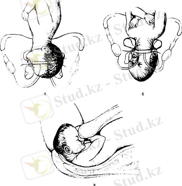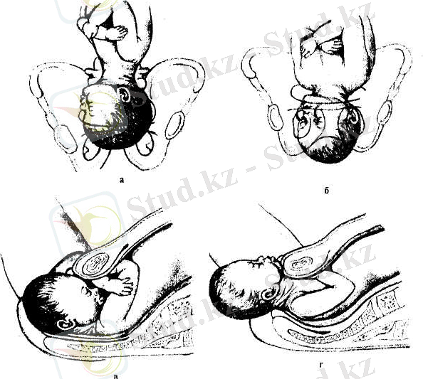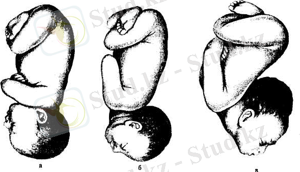 1-сурет. Нәресте басынын шалқая орнығуы: а - төбесімен; б - маңдайымен; в - бетімен орнығуы.