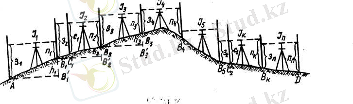 Lі станциясына нивелирді орнатады да артқы З және алдыңғы П х рейкалардан есептеулер алады. Содан кейін А нүк-тесіндегі рейканы В х нүктесіне апарып қояды да станциясынан 3 2 және П 2 есептеулерін алады, осылайша жүйелі түрде барлық жүрісте нивелирлеуді жүргізеді.