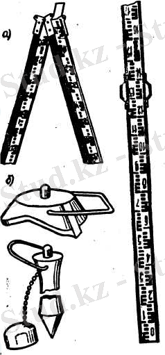 Нивелирдің вертикаль осін шамамен тік жағдайға келтіруге арналған дөңге-лек (12) үш түзету винттерімен жабдықталгаи. Невелир дүрбісін горизонталь жазықтықта жобалай айналдыру қыспа винтті (10) босатылған кезінде қолмен жасалалынады да, ал дәл затты нысаналау қыспа винт бекітулі кезде жетекші винтпен (11) 'жүргізіледі. Жіптер торының айқын кескінделуін окулярдың ди-оптриялық сақинасын (3), ал рейканың айқын кескінделуін фокустау құрылғысы-ныц маховигін (9) айналдыру арқылы келтіріледі. Дүрбіні жобалай нысаналау қарауылдың (7) көмегімен жасалынады. Нивелирлеу үшін тұтас немесе бүкте-мелі ағаш рейкалар (5-сурет) қолданылады, олар үзындығы 3-4 метр, ені 10 см және қалыңдығы 2-3 см бітеу түтас тақтай ағаш болып табылады. Тақтайлар ак майлы бояумен боялады және оларға сантиметрлік торкөз бөліктер түсіріледі Онда әрбір деаметр жазылады, ал сан тиметрлік бөліктер есептеулерді жеңілде ту үшін 5 см сайын топтарға біріктіріледі. Рейканың ең кішкене бөлігінің сандық шамасы рейка бөлігінің бағасы деп аталады. Тұтас рейканың ең үлкен ұзындығы 3 м-ге тең. Рейканың төменгі жағына рейканы тез тозудан қорғайтын болат пластинкадан тақа қағылып қойылады.