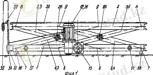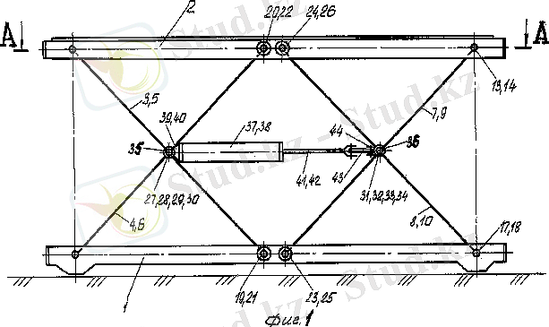 1-суретте жүк көтергіш берілген ИСТОЧНИК! . Ол негізден, жүк салатын платформадан, арасында және бір-біріне қарама-қарсы негізгі және қосымша жұпты топсалы иінтіректі механизім орналасқан. Әр қайсысы иінтіректі қиып өтетін екі топсалы жұптары бар, бір соңы гидроцилиндр бағыттауышқа құрастырылған, платформа мен негізге бекітілген және дағы иінтіректің басқа соңдары топсалы байланысқан, иінтіректің орынауыстыратын соңдары топсалы роликтің шетмойынды құралған негіздегі бағыттауышқа орнатылғанжәне жүк көтергіш платформадан. Электромеханикалық келтіру иінтіректі қозғалтуға негізделген, құралған айырмашылығы жүк көтергіш платформа қаңқа түрінде бойлық және көлденең арқалық құралған.