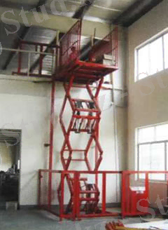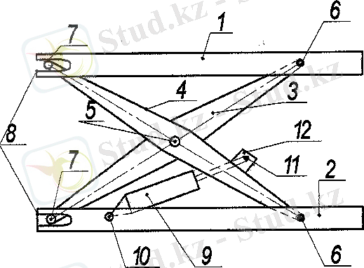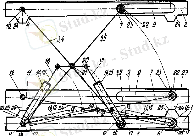 9-суретте берілген жүк көтергі платформада иінтіректі жұп негізгі бөлігі және жүк көтергіш платформа арасында орналасқан әрқайсысында иінтіректі қиып екі топсалы байланыс өтетін бар механизімнен тұрады. Бір жағы бағыттаушыға құрастырылған, платформа негізгі жүйемен бекітілген иінтіректің басқа жақтары топсалы байланысқан.