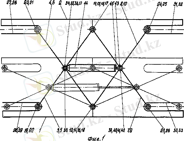 7-суретте жүк көтергіш берілген платформадан, арасында топсалы-иінтіректі механизім орналасқан, иінтіректі қылып жатқан екі топсалы байланысы бар, бір соңы бағыттауышқа құрастырылған платформа мен негізге бекітілген, иінтіректің басқа жақтары байланысқан және гидроцилиндр жұбы түрінде қозғалмалы келтіру, екі иінді иінтіректің соташықтар иінтіректі қиып жатқын, бірінші гидроцилиндр негізгі бір иінтіректің төменгі соңғы өсмен байланысқан. Негізінен топсалы байланысқан айырмашылығы, екінші гидроцилиндр негізгі басқа иінтіректің төменгі соңғы өсімен байланысқан.