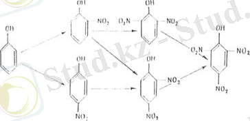 8. Фенолды нитрлеу сұйытылған азот қышқылының әрекет етуімен-ақ жүреді. О- және п-нитрофенолдардың (бірінші изомері көбірек) қосындысы алынады. Су буымен қоса буланғыштық қабілет тек қана о-изомерге тән болғандықтан, изомерлі нитрофенолдар оңай ажыратылады. о-нитрофенолдың күшті буландығтығы молекула ішінаралық сутектік байланыстың құрылуымен түсіндіреді, ал окси- және нитротоптар басқаша орналасқан уақытта молекула аралық сутектік байланыстар пайда болады: