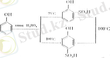 9. Фенолдарды сульфолағанда о- және п-фенолсульфоқышқылдар алынады. Қалыпты температурада концентрациялы күкірт қышқылы көбінесе о-изомер береді, ал 1000 С болғанда п-изомер басым болады.