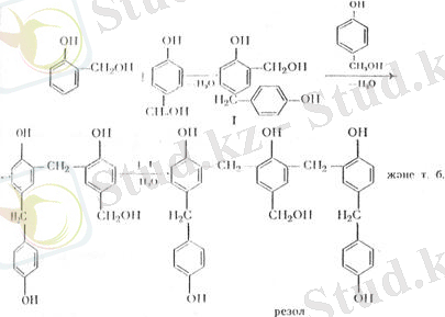 ә) фенолспирттердің сызықтық еритін полимерлерді (резол смоласы, резол) құрау арқылы конденсациялануы: