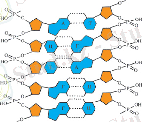 Мұнда бір тізбектің азотты негіздері екінші тізбектің азотты негіздерімен сутектік байланыс арқылы қосылыс түзеді. Сутектік байланыстың түзілуі - олардың азоттық негіздерінің өте жақын түйісуінің нәтижесі. Түйісетін нуклеотидтер белгілі бір заңдылыққа бағынады. Атап айтқанда, бір тізбекте А орналасса, оның қарсысындағы екінші тізбекте Т орналасады, демек А-ға - Т комплементті, ал Г-ге - Ц комплементті болады. Нуклеотидтердің осылай комплементке сәйкес орналасуының нәтижесінде, біріншіден, қосарлы сақинаның ұзына бойындағы тізбектердің ара қашықтығы бірдей болады, екіншіден, қарама-қарсы орналасқан негіздердің арасында берік сутектік байланыс түзіледі. Атап айтқанда, Г мен Ц арасында үш сутектік, ал А мен Т арасында екі сутектік байланыс түзіледі. Неғұрлым сутектік байланыс жиі болса, ДНҚ жіпшелері берік және оның молекуласының қозғалғыштығы тұрақты сақталатындығы дәлелденді 4-сурет) .