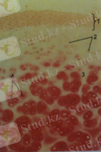 Беткі қабатында майда, аз маманданған хондроциттер орналасады. Аралық қабатындағы хондроциттер ірірек, дөңгелек пішінді болады. Оларың митохондриялары үлкен, түйіршікті эндоплазмалық торы мен Гольджи аппараты жақсы дамыған. Базальды қабат базофильді сызықпен екі қабаттқа бөлінеді, екінші қабатында қантамырлар болады.