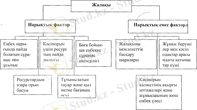 Нарықтық экономика талабына сәйкес жалақы көлеміне нәтижесінде белгілі бір еңбек ақы деңгейі құралатын нарықтық және нарықтық емес факторлар әсер етеді.