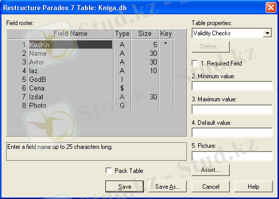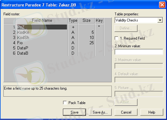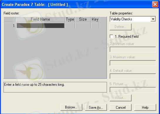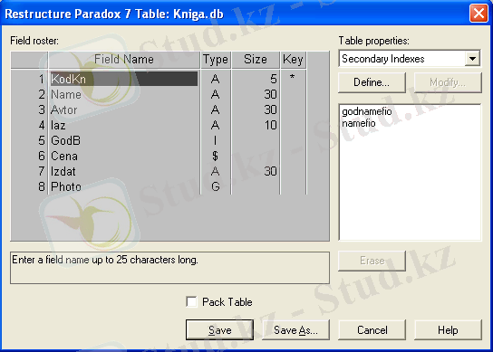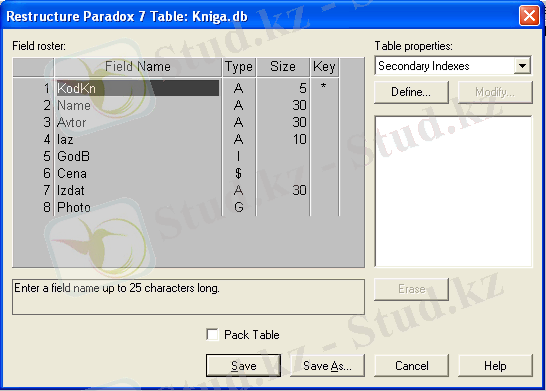 Сурет. 1 - Database Desktop утилиті: МБ кестесінің құрылымын анықтау терезесі