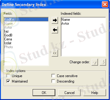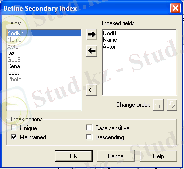 Жаңа индексті анықтау үшін, Define батырмасын басамыз. Көрінген диалогтық терезеде Fields өрісінде біз анықтаған кестенің тізім мазмұны көрсетіледі. Index Fields өрісінде құрылған индекске кірушілерді сақтау үшін тағайындалған. Fields тізімінен Index Fields тізіміне нақтылы өрісті көшіріп алу үшін оң бағдарша бейнелеуі бар батырманы басу керек. Өріске тізімді жүйелілі қосу маңызды, өйткені ол тізімде өрістің алмасу ретін анықтайды. Index Fields тізіміне керек өрістерді таңдаған соң ( сурет. 7), Ok батырмасын басамыз .