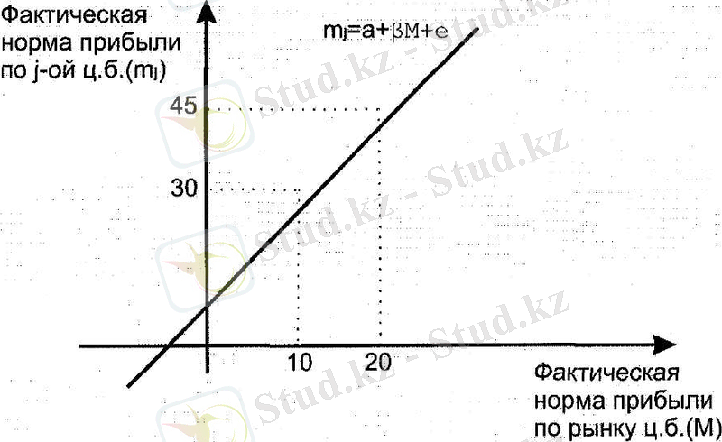 Аталған және 2 - суретте көрсетілген мысалда, бета коэффиценті мынаған тең β = (45 - 30) /(20 - 10) = 1, 5. Бұл нарықта жағдай өзгергенде, нарықтағы пайданың орташа нормасының төмендеуі немесе өсуі жағдайында, j - нші құнды қағаздың табыстылығы барлық нарыққа қатысты 1, 5 есе өзгеретіндігін білдіреді.
