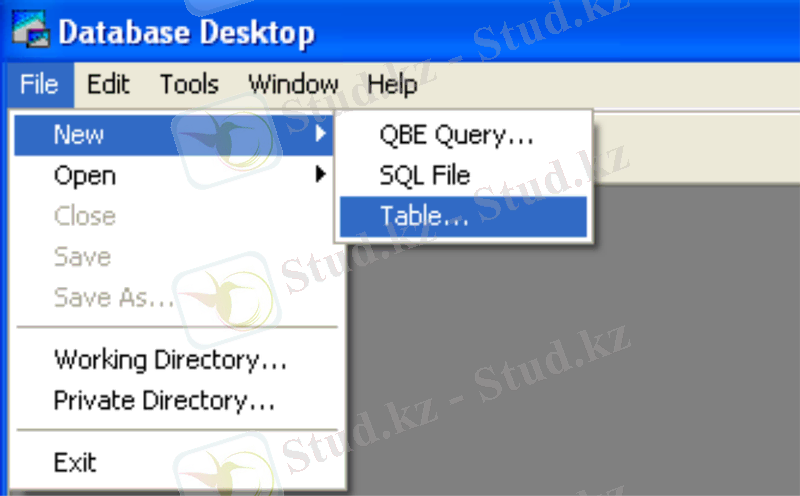 1. Database Desktop - ты ашып, File - New командасын таңдаған кезде мынадай менюді көреміз: