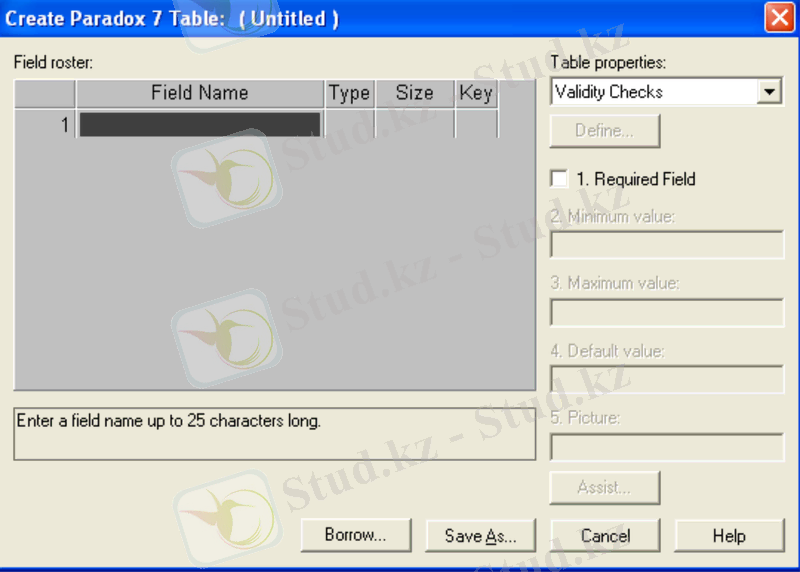 Validity Checks - бұл қасиет кестенің мәндерінің дұрыстығын тексереді. Бұл бөлімнің оң жақ терезесі 1. 2 - кестеде көрсетілген және өрістік типіне қарай өзгеріп отыруы мүмкін: