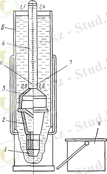 - алынбалы жүк; 2- өлшегіш стақан; 3- қалқыма; 4- шкаласы бар негіз; 5- шелек; 6- негізгі шкала; 7- қосымша шкала; 8- шелектің қақпағы.