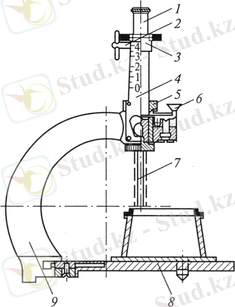 1 - стержень; 2 - винт; 3 - белгі; 4 - шкала; 5 - втулка; 6 - ысырма; 7 - ұшы; 8 - тақта; 9 - станина