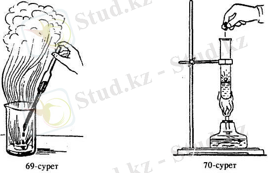 2-тәжірибе. Аммиакты зертханада алу. Ол үшін бірдей мөлшерде алынған құрғақ аммоний хлориді мен сөндірілген әкті қағаз бетіне салып, жақсылап араластырыңдар. Аммиактың бөлінгенін иісінен байқаңдар. Үлкен пробирканың 1/3 бөлігіне дейін осы заттардың қоспаларын салып, аузын имек түтігі бар тығынмен жауып, темір штативтің тағанына бекітіңдер. Жайлап қыздырып, бөлінген аммиакты төңкерілген пробиркада ауаны ығыстырып жияап алыңдар. Пробирканың аузын үлкен бармақпен басып, кристалдағыштағы суға батырыңдар да аузын ашыңдар. Пробирка суға толып кетеді. Пробиркадағы суға фенолфталеиннің ерітіндісін тамызсаңдар, судың күлгін түске боялғанын көресіңдер. Реакция теңдеуін жазыңдар.
