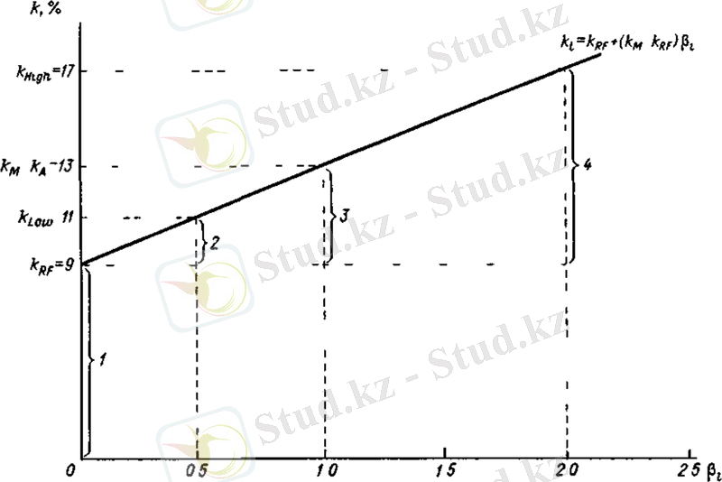 негізге алып өлшемге енеді, және акциялардың кірістілігі назарда болады, бағалы қағаздардың нарығының теңдеуімен ұштасады (Security Market Line, SML)