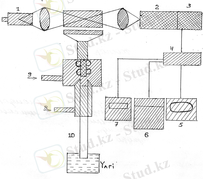 1 - резонанстық сәуленің сызықтық көзі, 2 - монохроматр, 3 - детектор, 4 - күшейіткіш, 5 - стрелкалық аспап, 6 - тіркегіш аспап, 7 - цифр басушы құрылым, 8 - тотықтырғышты еңгізгіш, 9 - отын енгізгіш, 10 - шашыратқыш, 11 - шашырайтын камера.