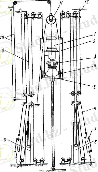 Беріс механизмінің және жайма механизмінің 10 екі гидроцилиндрлері 11 мачтаның негізінде орналастырылған. Мачтаның бойымен бағыттаушылар өтсе, ал оның шетімен айналдыру арбасы мен гирляндалар өтеді. Мачтаның көтерілуі мен түсірілуі мачта тіреулерінде орналасқан екі гидроцилиндрлермен іске асырылады.