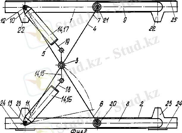 1. 10 суретте жүк көтергіш берілген платформадан, арасында топсалы-иінтіректі механизм орналасқан [7], иінтіректі қиып жатқан екі топсалы байланысы бар, бір соңы бағыттауышқа құрастырылған платформа мен негізге бекітілген, иінтіректің басқа жақтары байланысқан және гидроцилиндр жұбы түрінде қозғалмалы келтіру, екі иінді иінтіректің соташықтар иінтіректі қиып жатқын, бірінші гидроцилиндр негізгі бір иінтіректің төменгі соңғы өсмен байланысқан. Негізінен топсалы байланысқан айырмашылығы, екінші гидроцилиндр негізгі басқа иінтіректің төменгі соңғы өсімен байланысқан.