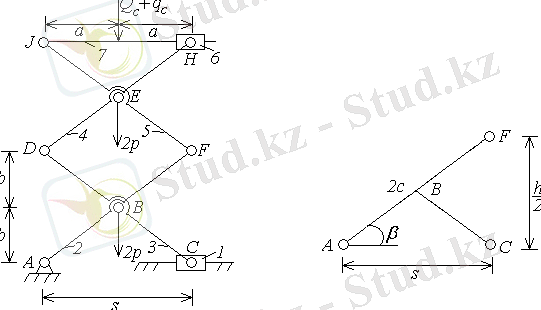 2. 1, а суретте 7 платформасы бар жүк көтеруші механизмнің кинематикалық сұлбасы және 1 кіріс буыны көрсетілген. “Нюрнберг қайшысы” атты дәстүрлі механизмді төменгі жетекті сұлбасы атау қабылданған, сызықтық қозғалыстың С сырғаның жалпыланған координатасы q=s; s=AС бар. Механизмнің кинематикалық сұлбасы буындар ұзындығымен AF=FJ=CD=2c және платформаның көтерлу биіктігімен h=AJ анықталады .