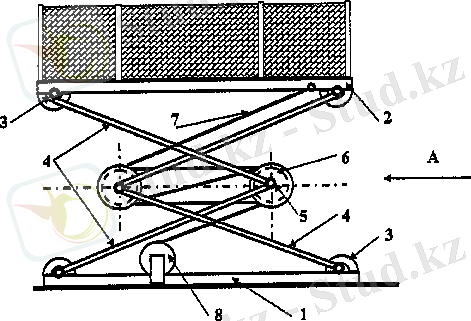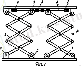 1. 12 суретте көрсетілген жүк көтергіш платформа және арасында орналасқан топсалы-иінтіректі механизмнен тұрады [8] . Айтылған механизмдер екі топсалы байланыс бар иінтіректі қиып өтетін бір соңы бағыттауышқа құрастырылған платформаға бекітілген және негізге иінтіректің басқа жақтарыда байланысқан және күш беруші гидроцилиндр жұбы түріндегі қозғалғыш келтіру кіреді. Бірінші гидроцилиндр бір иінтіректің төменгі өсімен топсалы байланысқан негізінен екінші гидроцилиндр басқа иінтіректің төменгі соңғы өсімен байланысқан.