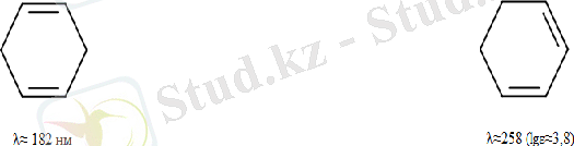 Сабақтаспаған диолефиндердің жұтылу сызықтары моноолефиндердің спектрлеріне ұқсас. Қос байланыстардың сабақтасуы кезінде 215-270 аумағында жалпақ интенсивті жолақ байқалады (lgε≈3. 3 ) . π 2 - π3 * ауысу энергетикалық жағынан тиімді, π - π * сабақтаспаған жүйенің ауысуына қарағанда, яғни сабақтасқан диеннің жұтылу жолағы ұзын толқынды аймаққа ығысады.