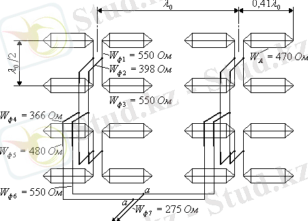 Бірінші талапты орындау үшін толқын ұзындығының жұмыс істеу диапазонында бір лентаның вибраторларының қозу синфаздылығын қамтамасыз ету керек. Фидердің таратушыға жалғану нүктесінен ( а-а ) әрбір вибраторға дейінгі таратушы фидерлердің бірдей ұзындығы кез-келген толқын ұзындығында вибраторлардың қоректендіру нүктесіндегі тоқ амплитудасы мен синфаздылығын қамтамасыз етеді.