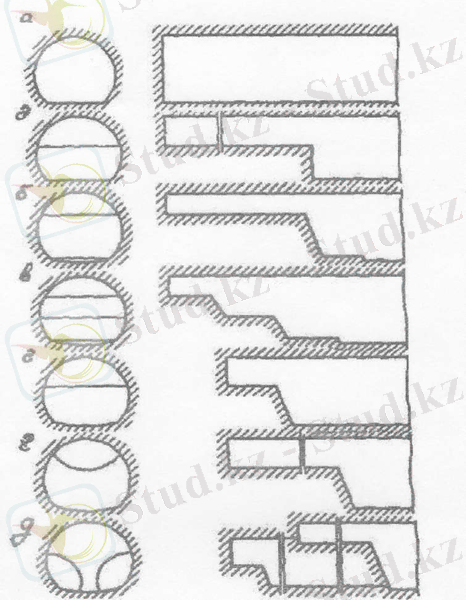 - Қазба жүргізу үшін забойды бірнеше учаскелерге (қабаттарға) бөледі. Қабаттардың саны забойдағы жыныстардың бекемдігіне байланысты болады. Тоннельдің толық қимасын ашудың ең көп тараған сұлбалары келтірілген. Қазбаны бұрғылап аттыру әдісімен немесе таңдаулы әрекетті комбайындарды қолдану арқылы жүргізеді. Кей жағдайларда механикаландырылған саймандпрды қолданп қолмен де жүргізеді. Қазылған участкалар шашыранды бетон, қарнақты, металл аркалы сияқты уақытша бекітпелермен бекітіледі.