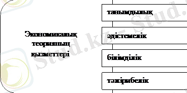 Экономикалық теорияның негізгі 4 қызметтерін бөлуге болады (1. 3 - сурет) . Мұның ішіндегі ең біріншісі - танымдылық қызметі : бұл қоғамдағы экономиканы зерттеу мен мәнісін түсіне білу және алған білімін ТЕОРЕТИКАЛЫҚ түрде, яғни жалпы және жүйелі түрде көрсете білу. Екінші қызметі - әдістемелік. Бұл барлық экономикалық ғылым жүйесіне арналған теориялық және әдістемелік базаларында қызмет істейді.