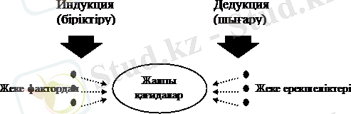 Индукция жеке оқиға құбылыстардан логика арқылы жалпы қағидалар, үрдістер шығарады. Дедукцияда керісінше, жалпы қағидалар негізінде экономикалық объектілердің, үрдістердің кейбір жеке алынған ерекшеліктері сипатталады.