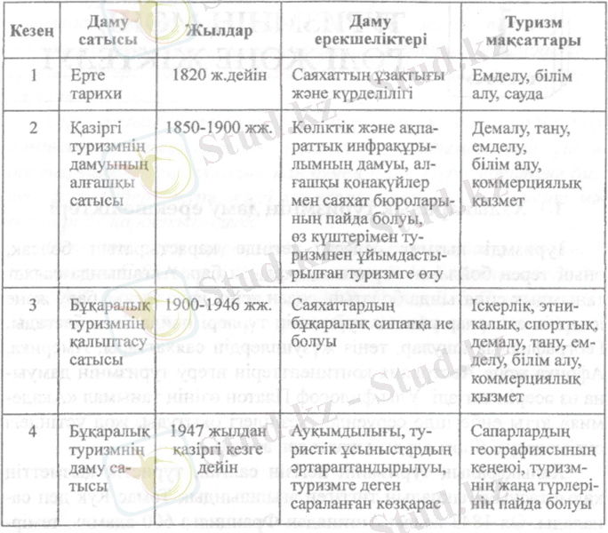Жалпы алғанда халықаралық туризмнің дамуын негізгі төрт кезеңге бөліп қарастыруға болады (1-кесте)