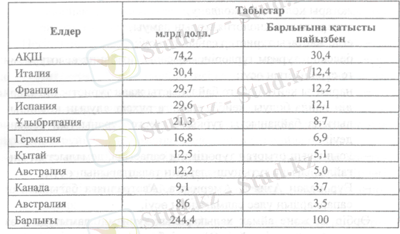 Кестеден көріп отырғанымыздай табыстың үлестік салмағы ең көп елдер - бүл АҚШ (30, 4%), Италия (12, 4%), Франция және Испания (12%) .