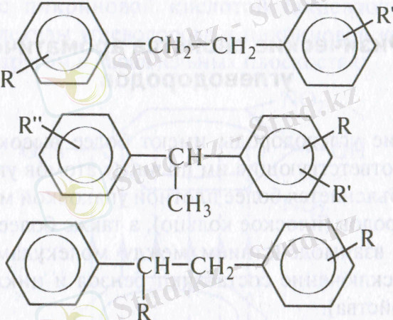 350°С көп фракцияларының құрамына бензолдың жоғары гомологтары мен нафталиннің гомологтарынан басқа, молекулаларында тосқауылданған ароматты атомдар көміртек көпірімен байланысқан көмірсутектер- диарилалкандар кіреді, мысалы: