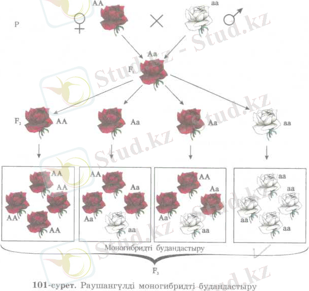 Гаметалар тазалығы ережесі. Бірінші буында алынатын будандардың біркелкі болуы мен екінші буын ұрпақтарында белгілердің ажырау құбылысын түсіндіру үшін, Мендель гамета тазалығы болжамын ұсынды. Оның мәні - организмнің кез келген белгі-қасиетінің дамуын тұқым қуалау факторы, яғни генді анықтайды. Мысалы, раушан гүлдің қызыл гүлділері мен ақ гүлділерін алып будандастырғанда, бірінші будандық ұрпақтың барлығы қызыл гүлді болған (101-сурет) . Ол бірінші будан ұрпақта қызыл гүлді өсімдіктің Доминантты «А» гені бар гаметасы мен ақ гүлдінің рецессивті «а» гені бар гаметаларының қосылуының нәтижесі болып есептеледі. Соңдықтан олардың генотипінде гүлдің қызыл түсін де, ақ түсін де анықтайтын гендер болады. Бірақ қызыл түстің гені доминантты