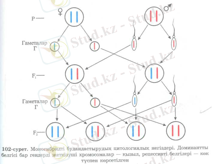 Организмнің кез келген дене жасушаларында хромосомалардың диплоидті жиынтығы бар екенін еске түсірейік. Бұршактың хромосомалар саны - 14, яғни 7 жұп. Алуан түрлі белгілерді анықтайтын аллельді гендер түрлі жұп хромосомалардың бірдей үйлескілерінде орналасқан. Мысалы, тұқымның түсін анықтайтын аллельді гендері бар бір ғана жұп хромосоманы алайық. Оның әр сыңарында: А - тұқымның сары түсін анықтайтын доминантты және а - жасыл түстің рецессивті гендері болады. Мейозды бөлінудің нәтижесінде пайда болған бұл сыңар хромосомалар қайтадан жұптасып, ондағы гендер де аллельді жұп құрайды (102-сурет) .