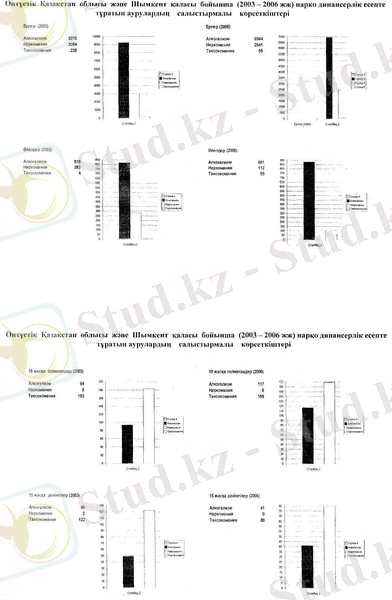 Жалпы алкогализм бойынша ерлер қатары 2003 жылға қарағанда бір шама төмендеген ал наркомания ерлер қатары жоғарылаған. Ал, таксикомания бойынша төмендеген. Енді әйелдерге келетін болсақ, 2003 жылға қарағанда 2006 жылғы көрсеткіші 818 ден 881 - ге артқан. Ал наркомания бойынша 282 ден, 112 ге төмендеген. Таксикомания бойынша 58 - 4 санына төмендеген. Ал енді 15 жасқа дейінгілер мен 18 жасқа толмағандар қатары алкогализм мен наркомания бойынша жоғары болса ал, таксикомаия бойынша 2003 - 2006 жыға қарағанда бір ама төмендеген.
