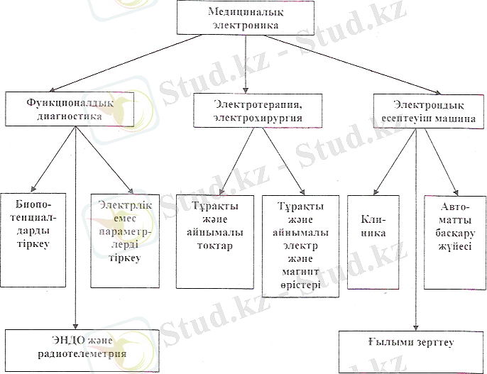 Қолдану бағытына байланысты электрондық-медициналық аппа-раттарды шартты түрде мынандай үш топка бөлуге болады (схеманы караңыз) : функционалдык диагностика, емдеу мақсатында адам ағза-сына әсер ету (физиотерпаия және электрохирургия), электрондык-есептеуіш машиналар жүйесі.