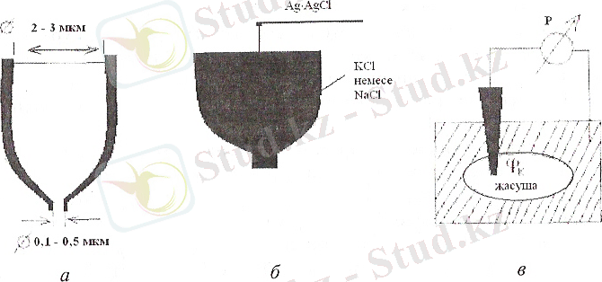 қапталған күміс (Ag) кыл сым қолданылады. Осы қысым микропипет-каға қүйылған KC1 немесе NaCl ерітіндісіне батырылады (86, б-сурет) . Ерітіндіге салынған екінші электрод - салыстыру электроды - жасушаның сыртқы бетіне орналастырылады. Сигнал түрақтыток күшейткішінентүратын өлше-уге арналған аппаратқа (Р) беріледі.