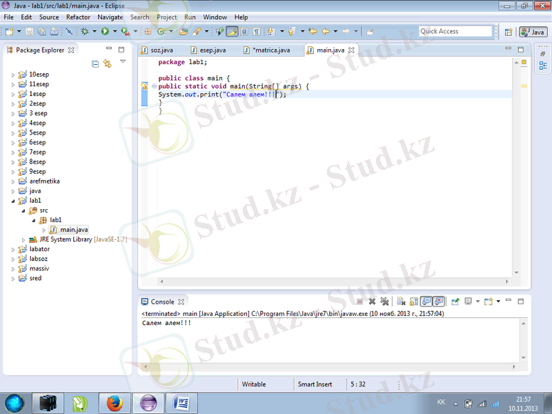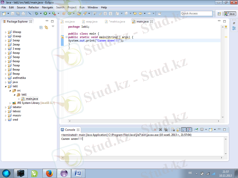 Жұмыстың мақсаты: Java бағдарламалау тілімен алғашқы танысу.