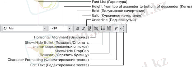 - Мәтінді форматтау және түзету үшін қолданылатын батырмалар:Character Formatting(Форматирование текста) - мәтін форматының параметрлерін өзгерту үшінCharacter Formatting(Форматирование текста) терезесін шақырады. Edit Text(Редактирование текста) - мәтінді түзетуге және форматтауға арналған параметрлері бар сұхбатEdit Text(Редактирование текста) терезені шығарады. Абзацный текст (Paragraph Text)