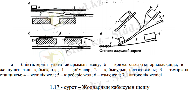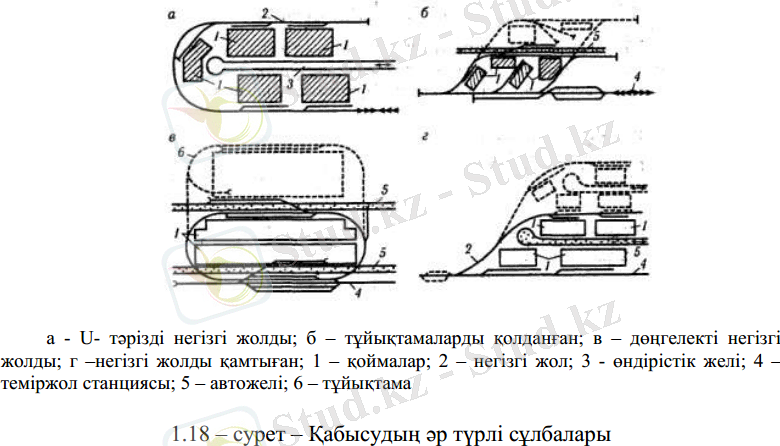 Егер жергілікті жер жағдайлары ыңғайлы болса, қоймаларды бір-бірінің артынан автокөлік желісінің бойымен орналастырады. Теміржол тасымал- дарының көлемі аз болғанда шаруашылық қажеттіліктерінің жолдары тиеу- түсірулік болуы мүмкін. Автокөлік және теміржол жолдарын қоймалық бөлмелердің әр түрлі жақтарында орналастыру мақсатты болып табылады (1. 17, б-сурет) .