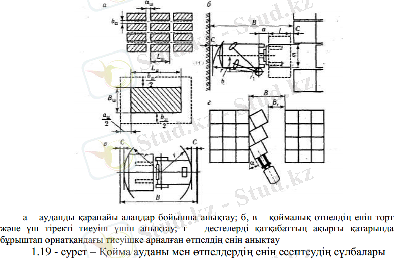 Тиеуіштер үшін табандықды қатқабатқа орнатқандағы немесе қатқабаттан алғандағы бұрылысын ескергендегі өтпелінің енін төмендегідей анықтайды. В - өтпелдің ені; rj, r - бұрылыстың ішкі және сыртқы радиустары; l - жүктің үзындығы; m - жүктің ені; с - тиеуіш пен қатқабат арасындағы минималды бос кеңістік (0, 15 - 0, 2 м) ; а - тиеуіштің алдынғы осінен ашалы қарпуышқа дейінгі қашықтық; b - тиеуіштің енінің жартысына және оған бұрылыстың ішкі радиусы қосылғанға тең қашықтық деп мәндерді қабылдаған соң қатқабатты тік бұрышпен орнатқандағы өтпелдің енін жүктің еніне байланысты анықтаймыз (1. 19, б-сурет) :