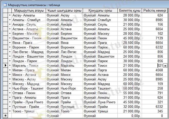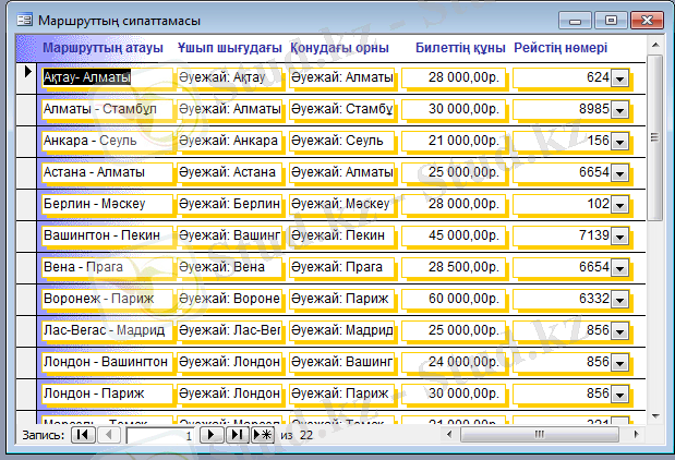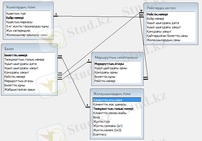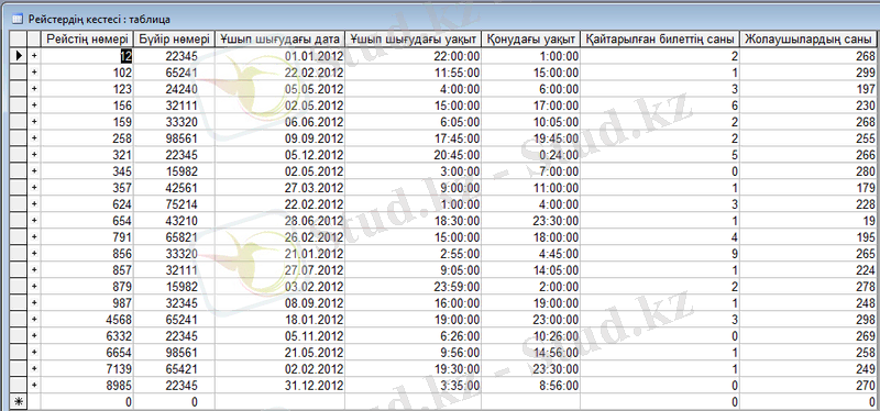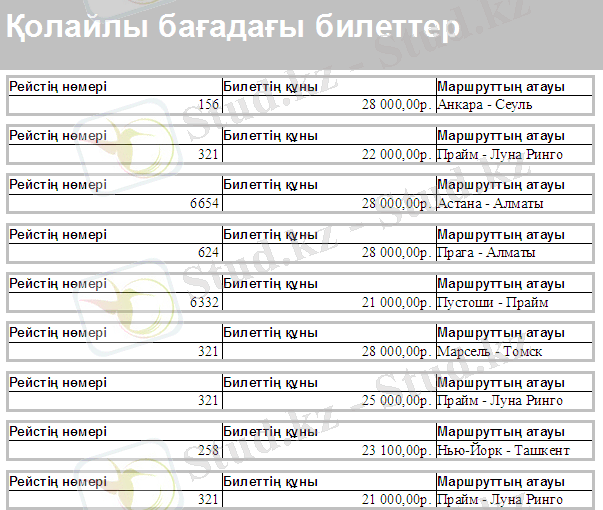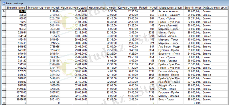- Рейстің кестесі туралы ақпарат (рейс нөмері, ұшақ түрі, жіберу орны, қабылдау орны, ұшып шығудағы дата, ұшып шығудағы уақыт, билеттің құны) .