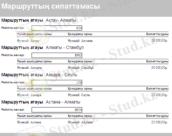 Маршруттың сипаттамасы ( маршруттың атауы, ұшып шығудағы орны, қонудағы орны, билеттің құны, рейстің нөмері) .