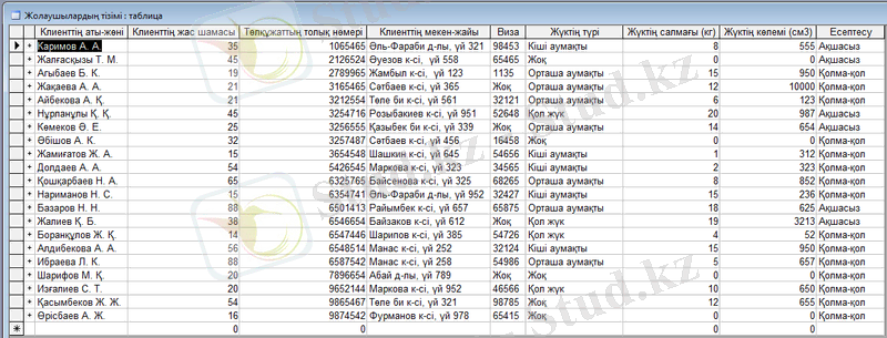 Жолаушылардың тізімі ( Төлқұжаттың толық нөмері, Клиенттің аты-жөні, Клиенттің жас шамасы, Клиенттің мекен-жайы, Виза, Жүктің түрі, Жүктің салмағы (кг), Жүктің көлемі (смЗ), Есептесу) .