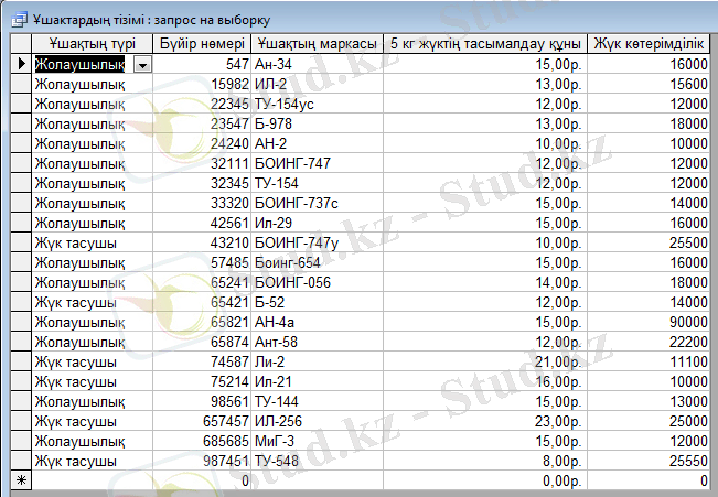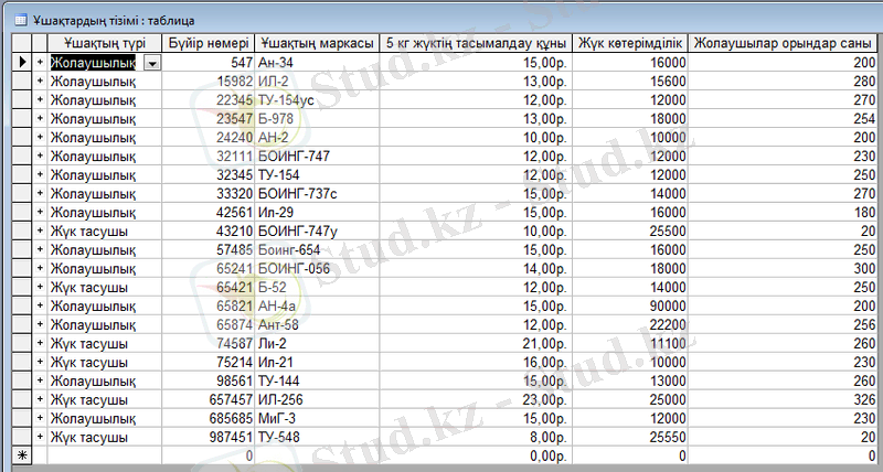 Ұшақтардың тізімі ( бүйір нөмері, ұшақтардың түрі, ұшақтың маркасы, 5 кг жүктің тасымалдау құны, жүк көтерімділік, жолаушылар орындыр саны) .