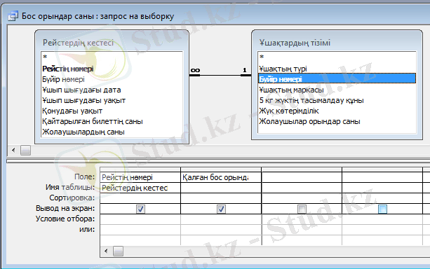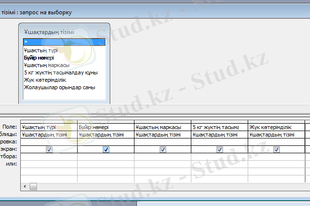 Сұраныстың келесі түрі - параметрлік: берілген параметр негізінде керекті ақпаратты іздеу. 5 суретте берілген сұраныс конструктор режимінде көрсетілген.